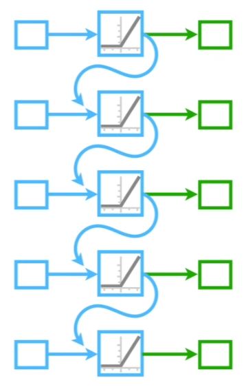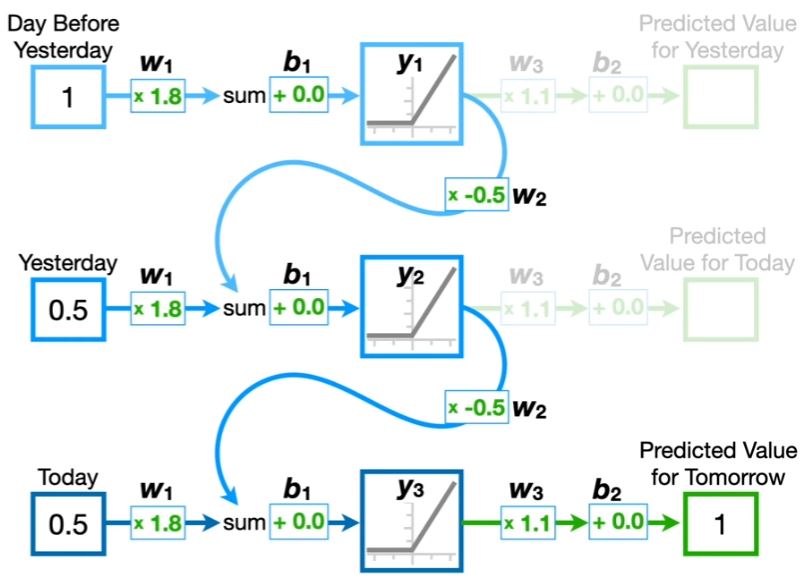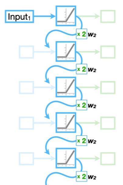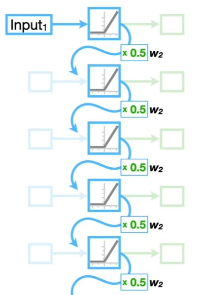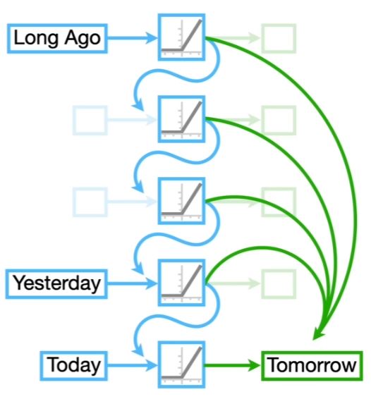 Untuk mengatasi permasalahan Vanishing atau Exploding Gradient berdasarkan beberapa sumber bisa menggunakan LSTM atau Long Short Term Memory yaitu dengan menambahkan jaringan tambahan seperti yang terdapat pada Visualisasi LSTM. Untuk garis lengkung berwarna biru adalah Short Term Memory sedangkan untuk garis lengkung berwarna hijau adalah Long Term Memory.